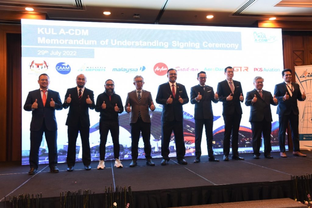 SEPANG – KL International Airport (KLIA) will be implementing Airport Collaborative Decision-Making (A-CDM) integrated system to increase the operational efficiency of its KLIA eco-system. The new initiative will see a collaboration between seven stakeholders at the airport including the Civil Authority of Malaysia (CAAM), Malaysia Airlines (MH), AirAsia (AK), Batik Air (ID), Aerodarat, Pos Aviation and Ground Team Red (GTR). The airport operator together with the government agency, airlines and ground handling companies signed a Memorandum of Understanding (MoU) witnessed by the Secretary General of the Ministry of Transport Malaysia, Datuk Isham Ishak earlier today to commemorate the collaboration. A-CDM system will be able to enhance the airlines’ On Time Performance (OTP) and help all parties strategically use resources and manage flight operations more effectively.